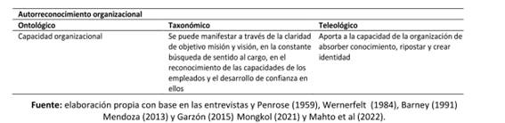 En concordancia con Cohen & Levinthal (1989) y (1990); Rothaermel & Deeds (2001); Minbaeva et al (2003); Jansen et al (2005); Todorova & Durisin (2007); Pertusa-Ortega et al (2007); Grimpe & Sofka (2009); Kostopoulos et al (2010); Rosenbusch et al (2011); Ritala & Hurmelinna (2013) y Hoque et al (2022), el trabajo permite definir al autorreconocimiento como una capacidad organizacional, que contribuye a tener claro los criterios de asignación de valor y construir identidad, por lo que resulta relevante en la etapa de identificación de la capacidad de absorción. Se manifiesta por medio de claridad de objetivos, misión y visión, constante construcción del sentido organizacional y el reconocimiento y confianza en las capacidades individuales. Resulta de un proceso subjetivo de reflexión sobre la empresa a partir de la observación del sí misma en sus audiencias, mediado por símbolos en constante evolución.