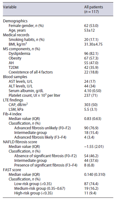 Patients were excluded in case of cirrhosis, pregnancy, ascites, liver transplantation, or hepatic surgery. Age, gender, BMI, obesity (BMI ≥30 kg/m2), current smoking habits, T2DM, AH, dyslipidemia data were collected for each patient. Platelet count, AST, ALT, and albumin levels were considered only when blood samples were collected within 6 months of the LTE performance, as validated by Newsome et al. [11].
