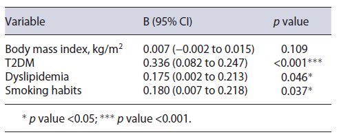 A multiple linear regression concluded that the pres-ence of T2DM (B = 0.165; 95% CI = 0.082-0.247; p < 0.001), dyslipidemia (B = 0.175; 95% CI = 0.002-0.213; p = 0.046), and smoking habits (B = 0.112; 95% CI = 0.007-0.218; p = 0.037) led to significantly higher FAST score values when adjusted for other variables. The model results are described in Table 2.