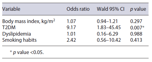 In order to evaluate if these variables would predict not only significantly higher FAST score values but also higher odds of the patient being assigned to the high-risk group, a binary logistic regression was executed with the same predictive variables. After this analysis, only T2DM (OR = 9.2; 95% CI = 1.8-45.5; p = 0.007) was found to be a significant predictive factor of the patient being in the high-risk group. Binary logistic regression results are shown in Table 3.