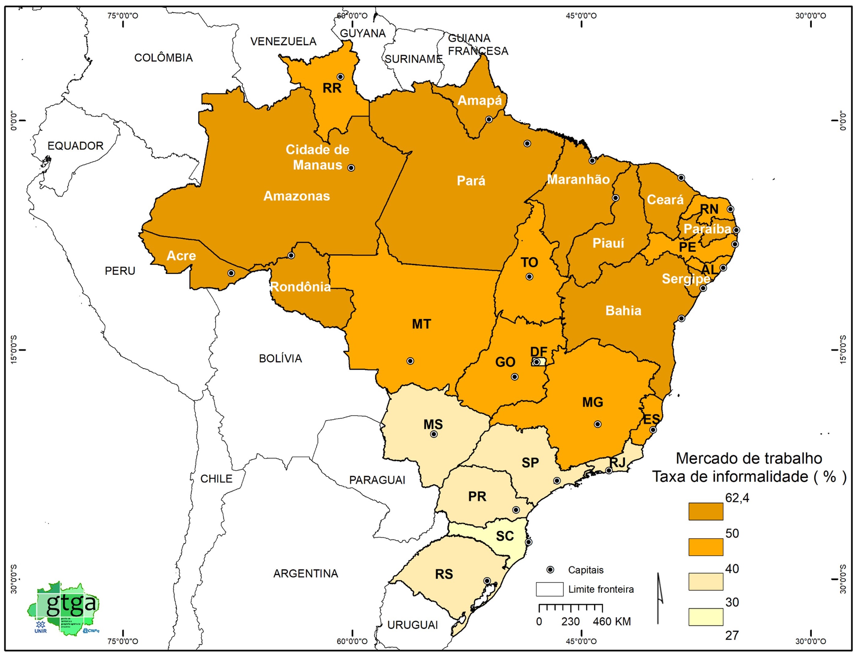 A taxa de informalidade no mercado de trabalho é um indicador de vulnerabilidade social muito importante, porque indica a intensidade da desigualdade sócioespacial e o grau de precariedade do mercado de trabalho. A informalidade refere-se ao conjunto de trabalhadores sem carteira assinada, de empregador sem registro legal, de trabalhadores autônomos e trabalhadores familiares auxiliar (Loschi, 2020). Em janeiro de 2020, a taxa média nacional da população ocupada em condições de informalidade atingiu 41,1%, seu maior índice desde 2016. A média nacional foi superada por 18 estados (variação de 41,2% a 62,4%), com forte evidência nas regiões Norte e Nordeste, onde 11 estados apresentam taxa de informalidade superior a 50%, com destaque para o Pará, com 62,4%, a maior taxa do Brasil (fig. 1) (IBGE, 2020).