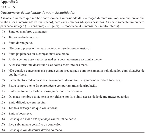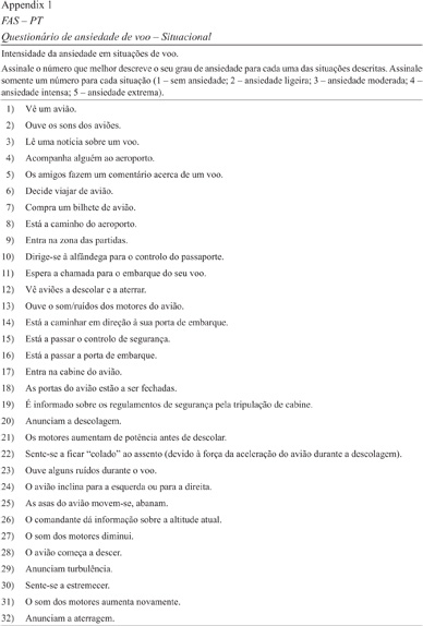 FAS and FAM are excellent measures, covering different type of responses to flight anxiety (physiological, psychological and behavioural reactions), and recording subjects’ reactions at various stages of the trip, from the preliminary phase (planning the trip, boarding) to the actual flight. These characteristics of the instruments allow a detailed assessment of the relevant phobic stimuli for each individual. The aim of this study was to translate FAS and FAM into Portuguese language and to assess its stability, internal consistency, convergent and divergent validities in a sample of Portuguese speaking population.