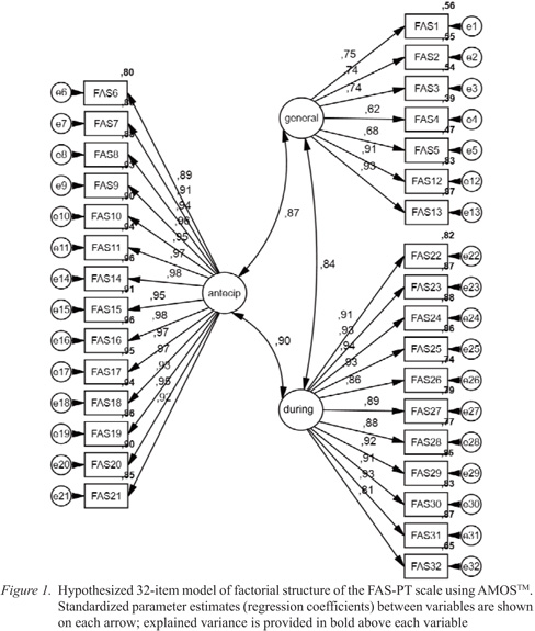 AMOSTM also allow to draw the hypothesized models of factorial structure of both FAS-PT and FAM-PT scales optimizing the standardized parameter estimates (regression coefficients) between variables, the explained variance for each variable and the co-variances between latent variables. Only 2 (out of the 32) standardized parameters in FAS-PT scale score below .70, and 22 (out of the 32) score above .90. On the same way there are no standardized parameters in FAM-PT scale that scores below .70, and 3 (out of the 18) score above .90. These results allow to conclude that, based upon the present sample, the translated scales of Van Gerwen – FAS-PT, and FAM-PT – on the overall can be regarded as behaving adequately on the Portuguese population (Figure 1 and 2).