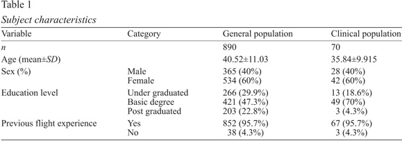 Mean age for general population sample was 40. 52 (SD±11.03) years for a minimum of 18 and a maximum of 78 years; 534 (60%) respondents were woman and 365 (40%) were men. Regarding education level, 266 (29.9%) of the participants were Under Graduated, 421 (47.3%) had a Basic Degree and 203 (22.8%) were Post Graduated. Regarding previous flight experience, 852 (95.7%) of the inquired had at least one flight experience and 38 (4.3%) never flew before.