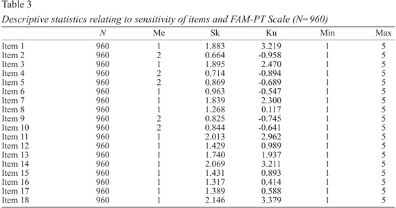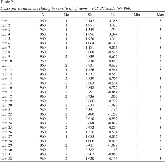 Regarding FAS-PT (Table 2) and FAM-PT (Table 3) the items distribution is asymmetrically positive, with Me values between 1 and 2.