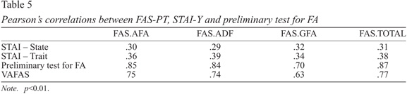 Convergent validity was tested through correlation between FAS-PT, Preliminary Test for FA and VAFAS. Results showed strong to very strong correlations between all FAS-PT Subscales and Screen Test for FA: FAS. AFA (r=.85, p<0.01), FAS.IFA (r=.84, p<0.01), FAS.GFA (r=.70, p<0.01), FAS.TOTAL (r=.87, p<0.01). Regarding VAFAS, showed strong correlations for all FAS-PT Subscales: FAS.AFA (r=.75, p<0.01), FAS.IFA (r=.74, p<0.01), FAS.GFA (r=.63, p<0.01), FAS.TOTAL (r=.77, p<0.01).
