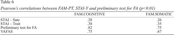 Convergent validity was tested through correlation between FAM-PT, Preliminary Test for FA and VAFAS. Results showed strong to very strong correlations between all FAM-PT Subscales and Screen Test for FA: FAM.COGNITIVE (r=.82, p<0.01) and FAM.SOMATIC (r=.75, p<0.01). Regarding VAFAS, showed strong correlations for all FAM-PT Subscales: FAM.COGNITIVE (r=.75, p<0.01) and FAM.SOMATIC (r=.67, p<0.01).