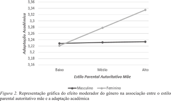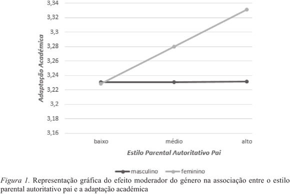 Por último e de encontro aos objetivos propostos, verificou-se um efeito moderador do género na associação entre o estilo parental autoritativo, face ao pai e à mãe, e a adaptação académica. Foram realizadas outras moderações entre o estilo parental autoritário pai e mãe e a adaptação académica e entre o estilo parental permissivo pai e mãe e a adaptação académica, contudo, não se verificou um efeito moderador do género nesta associação. Ou seja, o género parece não exercer qualquer diferença na associação dos estilos parentais permissivo e autoritário (pai e mãe) na adaptação académica dos jovens adultos. Por outro lado os resultados sugerem que quanto mais elevada for a perceção de um estilo parental autoritativo (pai e mãe), maior é a adaptação académica das raparigas, ao mesmo tempo, parecem não existir alterações na adaptação académica dos rapazes quando aumenta a perceção do estilo parental autoritativo. Desta forma, parece que uma maior perceção de um estilo parental autoritativo parece ser um fator preponderante para o desenvolvimento de uma maior adaptação académica nas raparigas. Estes resultados são consistentes com a literatura que evidencia que os rapazes parecem estar mais voltados para o contexto, na sua generalidade, ao passo que as raparigas estão mais voltadas para as relações de afeto. Esta afirmação é justificada pelo facto de o sexo feminino evidenciar uma socialização pautada pela dinâmica relacional, constatando-se uma maior perceção dos estilos parentais (e.g., Muris, Meesters, Merckelbach, & Hülsenbeck, 2000). Também se verifica na literatura que um estilo parental autoritativo parece favorecer uma maior adaptação académica, neste sentido, o sexo feminino parece evidenciar um maior investimento parental e níveis mais elevados de realização, comparativamente aos rapazes que são mais orientados para a socialização (e.g., Baumrind, 1971; Brand et al., 2011; Olivari, Wahn, Maridaki-Kassotaki, Antonopoulou, & Confalonieri, 2015). Verifica-se um maior investimento parental percecionado pelo sexo feminino, estes resultados são consistentes com a literatura onde é sugerido que nos rapazes comparativamente com as raparigas, é reportada uma maior pontuação para os estilos parentais mais negativos (autoritário e permissivo) (e.g., Brand et al., 2011; Olivari et al., 2015). Hutz e Bardagir (2006) constataram que o sexo masculino assume condutas e formas de estar mais externalizantes, tendo uma perceção diferente da influência parental, comparativamente com o sexo feminino. As conclusões formuladas vão ao encontro da conceção de Baumrind (1985), sugerindo que o estilo autoritativo tem um efeito significativo no desenvolvimento de competências que permitam enfrentar situações geradoras de stress. Os pais autoritários adotam estratégias focalizadas na punição e obediência, não existindo espaço para o diálogo. Desta forma, esse controlo limita o desenvolvimento da autonomia. Derivado desta conduta, surgem comportamentos dependentes, submissos, reações passivo-agressivas e baixas motivações para realizações, gerando desta forma, um baixo bem-estar psicológico e consequente dificuldade de adaptação ao meio académico. Segundo Baumrind (1971), quando comparados com os filhos de pais autoritativos, as raparigas são menos assertivas do ponto de vista social e os rapazes são menos orientados para a realização. As raparigas parecem ser mais dominantes, independentes e orientadas para a realização, ao contrário dos rapazes que parecem ser socialmente mais responsáveis, altruístas e socialmente maduros (Baumrind, 1971). Num estudo desenvolvido por Boeckel e Sarriera (2006), que pretendeu testar o efeito dos estilos parentais, estilos atribucionais e bem-estar psicológico em 323 jovens universitários de ambos os sexos, os investigadores também concluíram que o estilo parental autoritativo prediz o bem-estar psicológico, sendo que uma maior intensidade deste estilo parental corresponde a elevados níveis de bem-estar psicológico. Pelo contrário, concluíram que quanto maior a intensidade do estilo parental autoritário, menor o nível de bem-estar psicológico. Desta forma, verifica-se que as figuras parentais que promovem a responsabilidade, autonomia, autoconfiança e assertividade do jovem adulto, parecem criar condições necessárias para que o jovem adulto tenha um maior rendimento académico comparativamente aos jovens que percecionaram as figuras parentais como pouco apoiantes. Num estudo com 641 jovens, os investigadores Juang e Silbereisen (2002) constataram que as condutas parentais, tais como, o afeto, envolvimento, as discussões acerca dos assuntos académicos e intelectuais estão relacionados com uma maior capacidade académica e melhores resultados escolares evidenciados pelos jovens. Pelo contrário, um estilo parental autoritário estimula comportamentos de evitamento em situações de realização, o que evidencia repercussões negativas nos resultados escolares (Fontaine 1988). Pelo exposto, uma maior perceção de um estilo parental autoritativo revela-se um fator preponderante para o desenvolvimento de uma maior adaptação académica nas raparigas.