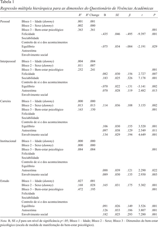 Na análise de regressão múltipla hierárquica face à dimensão pessoal das escalas de vivências académicas foram introduzidos 3 blocos: no bloco 1 a idade (Dummy), não contribui significativamente para a variância do modelo F(1,785)=1.09, p=.30, explica 0.1% da variância total (R2=.001) e contribui individualmente com 0.1% da variância para o modelo (R2 change=.001). No bloco 2 o sexo (Dummy) não apresenta um contributo significativo F(2,784)=.66, p=.52, explica 0.2% da variância total (R2=.002), não apresentando um contributo individual (R2 change=.000). No bloco 3 o bem-estar psicológico contribui significativamente para o modelo F(8,778)=55.41, p=.001 e explica 36.3% da variância total (R2=.363), apresentando um contributo individual de 36.1% (R2 change=.361). Analisando individualmente o contributo de cada uma das variáveis independentes dos blocos, constata-se que duas variáveis apresentam uma contribuição significativa, estas são apresentadas por ordem de importância: felicidade (β=-.495) e equilíbrio (β=-.084) (Tabela 1). Na análise de regressão múltipla hierárquica face à dimensão interpessoal das escalas de vivências académicas foram introduzidos 3 blocos: no bloco 1 a idade (Dummy), contribui significativamente para a variância do modelo F(1,785)=3.49, p=.003, explica 0.4% da variância total (R2=.004) e contribui individualmente com 0.4% da variância para o modelo (R2 change=.004). No bloco 2 o sexo (Dummy) apresenta um contributo significativo F(2,784)=4.42, p=.01, explica 1.1% da variância total (R2=.011), apresentando um contributo individual com 0.7% da variância para o modelo (R2 change=.007). No bloco 3 o bem-estar psicológico contribui significativamente para o modelo F(8,778)=32.775, p=.001 e explica 25.2% da variância total (R2=.252), apresentando um contributo individual de 24.1% da variância para o modelo (R2 change=.241). Analisando individualmente o contributo de cada uma das variáveis independentes dos blocos, constata-se que quatro variáveis apresentam uma contribuição significativa, estas são apresentadas por ordem de importância: sociabilidade (β=.326), felicidade (β=.156), equilíbrio (β=-.131) e autoestima (β=.119) (Tabela 1). No que respeita à dimensão carreira das escalas de vivências académicas, foram introduzidos 3 blocos: no bloco 1 a idade (Dummy), não contribui significativamente para a variância do modelo F(1,785)=.02, p=.90, não apresentando um contributo para a variância total (R2=.000) nem apresentado um contributo individual (R2 change=.000). No bloco 2 o sexo (Dummy) apresenta um contributo significativo F(2,784)=5.10, p=.006, explica 1.3% da variância total (R2=.013), apresentando um contributo individual com 1.3% da variância para o modelo (R2 change=.013). No bloco 3 o bem-estar psicológico contribui significativamente para o modelo F(8,778)=18.950, p=.001 e explica 16.3% da variância total (R2=.163), apresentando um contributo individual de 15% da variância para o modelo (R2 change=.150). Analisando individualmente o contributo de cada uma das variáveis independentes dos blocos, constata-se que quatro variáveis apresentam uma contribuição significativa, estas são apresentadas por ordem de importância: envolvimento (β=.194), equilíbrio (β=.155), autoestima (β=.129) e sexo (β=.108) com contributo do género feminino (Tabela 1). No que concerne à dimensão institucional das escalas de vivências académicas, foram introduzidos 3 blocos: no bloco 1 a idade (Dummy), não contribui significativamente para a variância do modelo F(1,785)=.13, p=.72, não apresentando um contributo para a variância total (R2=.000) nem apresentado um contributo individual (R2 change=.000). No bloco 2 o sexo (Dummy) não contribui significativamente para a variância do modelo F(2,784)=.14, p=.87, não apresentando um contributo para a variância total (R2=.000) nem apresentado um contributo individual (R2 change=.000). No bloco 3 o bem-estar psicológico contribui significativamente para o modelo F(8,778)=8.96, p=.001 e explica 8.4% da variância total (R2=.084), apresentando um contributo individual de 8.4% da variância para o modelo (R2 change=.084). Analisando individualmente o contributo de cada uma das variáveis independentes dos blocos, constata-se que duas variáveis apresentam uma contribuição significativa, estas são apresentadas por ordem de importância: equilíbrio (β=.135) e autoestima (β=.121) (Tabela 1). Na dimensão estudo das escalas de vivências académicas, foram introduzidos 3 blocos: no bloco 1 a idade (Dummy), não contribui significativamente para a variância do modelo F(1,785)=.56, p=.46, explica 0.1% da variância total (R2=.001), apresentando um contributo individual com 0.1% da variância para o modelo (R2 change=.001). No bloco 2 o sexo (Dummy) apresenta um contributo significativo F(2,784)=11.38, p=.001, explica 2.8% da variância total (R2=.028), apresentando um contributo individual com 2.8% da variância para o modelo (R2 change=.028). No bloco 3 o bem-estar psicológico contribui significativamente para o modelo F(8,778)=27.93, p=.001 e explica 22.3% da variância total (R2=.223), apresentando um contributo individual de 19.5% da variância para o modelo (R2 change=.195). Analisando individualmente o contributo de cada uma das variáveis independentes dos blocos, constata-se que quatro variáveis apresentam uma contribuição significativa, estas são apresentadas por ordem de importância: envolvimento (β=.293), autoestima (β=.186), sexo (β=.175) com contributo do género feminino e equilíbrio (β=.149) (Tabela 1).