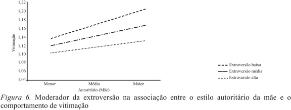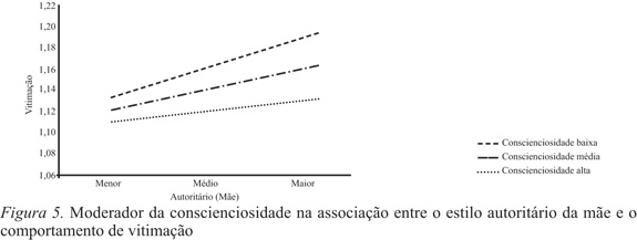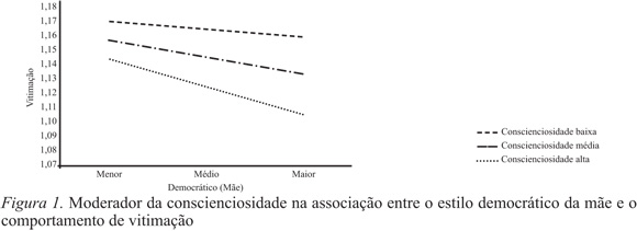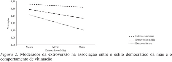 Na associação entre o estilo democrático da mãe e a vitimação, os resultados indicam um papel moderador da extroversão ΔF(3,1972)=19.133; p=.001 e da conscienciosidade ΔF(3,1972)=16.230; p=.001. Verificou-se que os jovens que percecionam um estilo democrático elevado e apresentam, ao mesmo tempo, níveis de extroversão e conscienciosidade mais altos revelam menores níveis de vitimação (Figura 1 e 2).