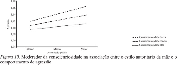 Ainda no mesmo estilo, verificou-se um papel moderador da conscienciosidade na associação entre o estilo autoritário da mãe e o comportamento de agressão ΔF(3,1972)=23.44; p=.001. Verificou-se que mesmo na presença de níveis elevados do estilo autoritário, quanto maiores fossem os índices da conscienciosidade, menores eram os índices de agressão (Figura 10).