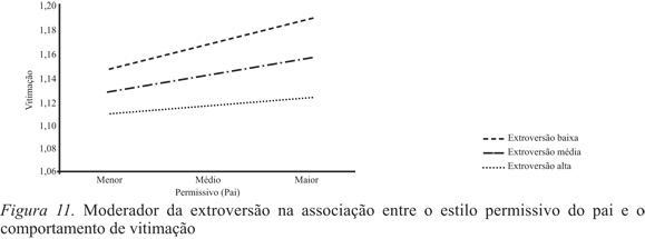 Por último, na associação entre o estilo permissivo dos pais e a vitimação verificou-se a presença de um papel moderador por parte da extroversão ΔF(3,1972)=20.36; p=.001. Na presença de um elevado estilo permissivo, todavia com níveis de extroversão mais altos, os níveis de vitimação eram menores (Figura 11).