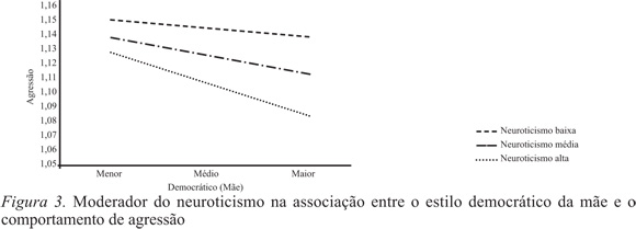 No que se refere à associação entre o estilo democrático da mãe e a agressão foi verificado a existência de um papel moderador por parte da variável neuroticismo ΔF(3,1972)=22.28; p=.001. Assim, verificou-se que mesmo na presença de elevados níveis do estilo democrático, quanto maiores fossem os índices de neuroticismo, maiores eram, também, os níveis de agressão (Figura 3).