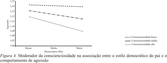 Verificou-se, também, a presença de um papel moderador da conscienciosidade na associação entre o estilo democrático do pai e a agressão ΔF(3,1972)=17.15; p=.001. Os resultados indicam que quanto mais elevado era o estilo democrático e os níveis de conscienciosidade, menores eram os índices de agressão (Figura 4).