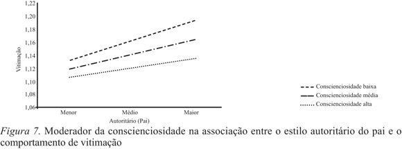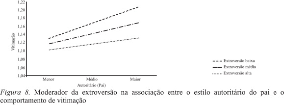 No que se refere à associação entre o estilo autoritário da mãe e a vitimação, os resultados indicam a presença de um papel moderador por parte da extroversão ΔF(3,1972)=29.71; p=.001 e da conscienciosidade ΔF(3,1972)=24.97; p=.001. Resultados idênticos foram apurados na associação entre o estilo autoritário do pai e a vitimação: extroversão ΔF(3,1972)=34.87; p=.001 e conscienciosidade ΔF(3,1972)=27.29; p=.001. Verificou-se que embora os jovens apresentassem níveis elevados de estilo autoritário em ambas figuras parentais, na presença de níveis de extroversão e conscienciosidade elevados, revelam menores índices de vitimação (Figura 5, 6, 7 e 8).