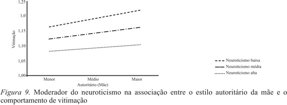 Ainda na associação entre o estilo autoritário da mãe e a vitimação verificou-se a presença de um papel moderador por parte do neuroticismo ΔF(3,1972)=73.95; p=.001. Os jovens que percecionavam elevados níveis do estilo autoritário, mas revelavam ao mesmo tempo níveis baixos de neuroticismo, apresentavam menores índices de vitimação (Figura 9).
