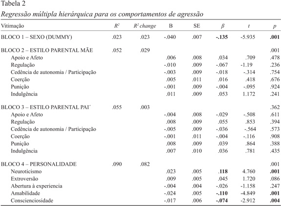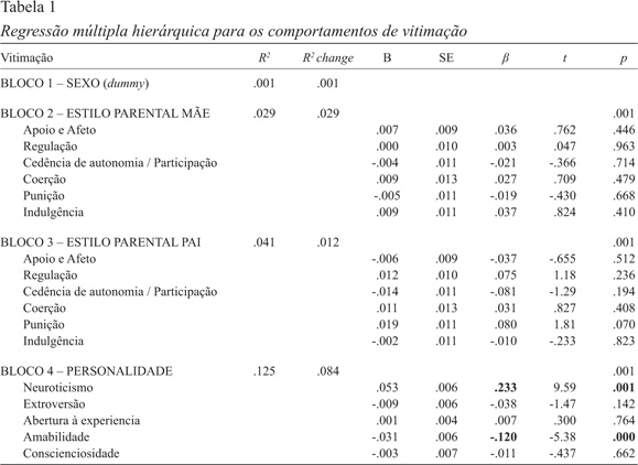 As análises de regressão múltipla hierárquica face à vitimação foram realizadas mediante a introdução de 4 blocos: no bloco 1 o sexo (dummy) não apresenta um contributo significativo F(1,1974)=1.53; p=.216, explica 0.1% da variância total (R2=.001) e contribui individualmente com 0.1% da variância para o modelo (R2change=.001). No que se refere ao bloco 2, estilos parentais mãe, contribui significativamente para a variância do modelo F(7,1968)=8.50; p=.001, e explica 2.9% da variância total (R2=.029), apresentando um contributo individual de 2.9% (R2change=.029). Relativamente ao bloco 3, foi introduzido os estilos parentais pai que se mostra significativa F(13,1962)=6.45; p=.001 e explica 4.1% da variância total (R2=.041), apresentando um contributo individual de 1.2% (R2change=.012). Por último, no bloco 4, a personalidade apresenta um contributo positivo F(18,1957)=15.56; p=.001 e explica 12.5% da variância total (R2=.125), mostrando assim um contributo individual de 8.4% (R2change=.084). Através da análise individual do contributo de cada uma das variáveis independentes dos blocos, verifica-se a existência de duas contribuições significativas (p<.05) enquanto preditores de comportamentos de vitimação, cuja apresentação será efetuada por ordem de importância: neuroticismo (β=.233) e amabilidade (β=-.120) (Tabela 1).