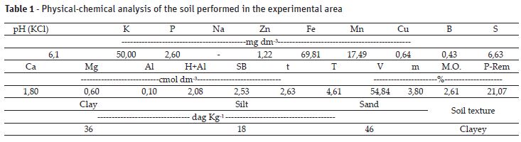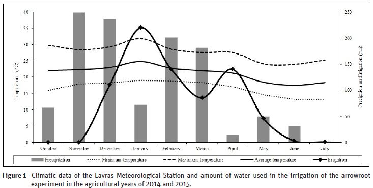 The experiment was conducted between October 2014 and August 2015, in the experimental area of the Olericulture Sector of the Department of Agriculture of the Federal University of Lavras (UFLA) in Lavras, south of the State of Minas Gerais, Brazil, which is located at the latitude 21º 14’ S, longitude 45º 00’ W and altitude 918,8 m. The climate of the region, according to the climatic classification of Köppen, is Cwa (mesothermal) with dry winters and rainy summers (Brasil, 1992). During the experiment, in the region, the average air temperature was 21.2ºC, and the minimum and maximum averages were 16.6ºC and 27.7ºC, respectively. The total rainfall was 1105.6 mm, with the wettest month being November with a level of 249.4 mm and the driest month being July with a level of 1.7 mm. The climatic data of the experimental area during the field stay are shown in Figure 1.