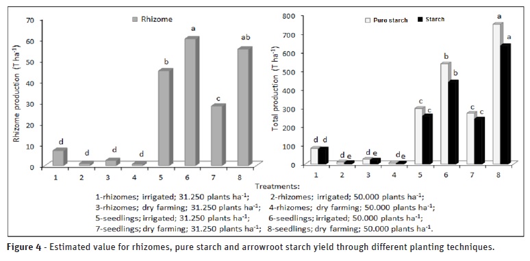 With the association of rhizome productivity data, yield on the extraction and amount of starch it is possible to estimate the production by area. The treatment 2 (conducted without irrigation, by seedlings and density of 50000 plants ha-1) presented a higher yield in the extraction (13.54 g 100 g-1), which reached a yield of 55.31 t ha-1 rhizomes, with 7.49 t ha-1 starch, and 6.35 t ha-1 starch. In addition, the irrigated treatment, produced by seedlings and in the density of 50000 plants ha-1, which despite the lower yield (8.94 g 100 g-1) had a good productivity in the field (60.09 t ha-1) that compensated the final starch production with 5.37 t ha-1 and 4.40 t ha-1 of starch (Figure 4) also deserves to be mentioned.