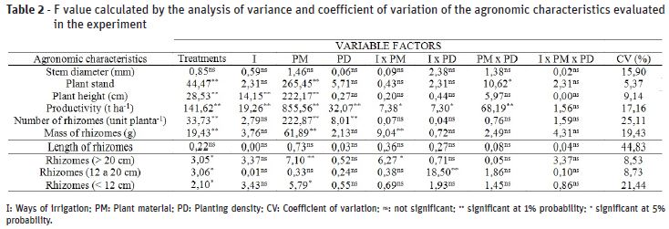 According to the analysis of variance (Table 2), the interaction between all the agronomic managements adopted in the experiment (PM x I x PD) was not significant for the evaluated characteristics. However, significant double interactions were observed for the characteristics of plant stand, productivity, weight and rhizome size.