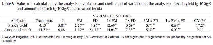 Table 3 shows the combined effect of irrigation and plant material, as well as the plant material and plant density in the starch yield. For starch, there was a combined effect of the three analyzed factors (I x PM x PD).