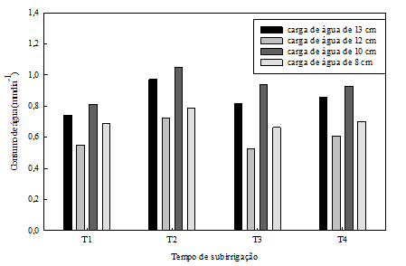 Figura 1 Consumo hídrico (mm.dia-1) da capuchinha (Tropaeolum majus L), cultivada em vasos, para as diferentes cargas de água e tempos de subirrigação.