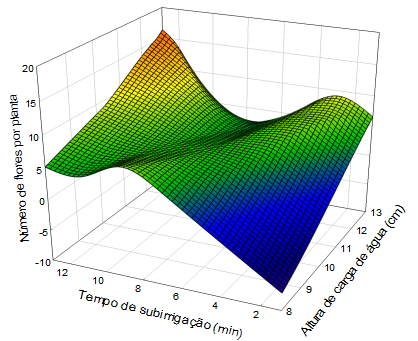 A Figura 2 apresenta os valores médios de número de flores por planta em função dos fatores altura da lâmina de água e tempo de subirrigação. A produção máxima, de 9 flores por planta, foi alcançada na maior altura de lâmina em que a planta foi submetida (13 cm) no tempo de subirrigação de 3 minutos (100% da CV). Os resultados obtidos foram superiores ao encontrado por Melo et al. (2003), com produção média de cinco flores por planta computadas a partir do 55º DAT, ao avaliarem o crescimento da capuchinha (Tropaeolum majus) em hidroponia.