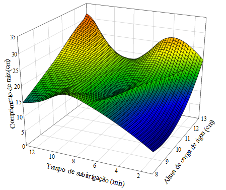 As médias do comprimento da raiz em função dos fatores altura de lâmina e tempo de subirrigação, são apresentadas na Figura 3, onde é possível observar que o maior comprimento foi de 26,25 cm, alcançado na altura de lâmina de água de 13 cm, no tempo de subirrigação de 3 minutos (100% da CV). Os resultados mostram que o comprimento da raiz decresce, conforme diminui a altura da lâmina. Assim, quanto menor a quantidade de água aplicada, via subirrigação na planta, menor tende a ser o seu comprimento radicular e seu porte.
