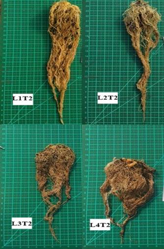 A avaliação do sistema radicular da planta, foi realizada aos 180 DAT, por meio da retirada da planta inteira do vaso, sem danificar as raízes. As mesmas foram depois lavadas em água corrente, a fim de retirar o excesso de substrato.