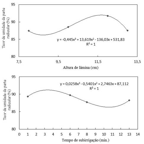 A Figura 5 apresenta o teor de umidade do sistema radicular da capuchinha, em função das alturas de lâminas e tempos de subirrigação. A variável, em ambas as situações, ajustou-se a uma equação de terceiro grau, com coeficiente de determinação (R2) de 1. Na Figura 5a, para a variável em função da altura de lâmina, alcançou-se a máxima eficiência técnica (MET) na altura de carga de água de 11,67 cm, correspondente a 91,86% de teor de umidade. Já, a MET para o tempo de subirrigação (Figura 5b) ocorreu aos 3,34 min, com um teor de umidade da parte radicular de 91,22%.