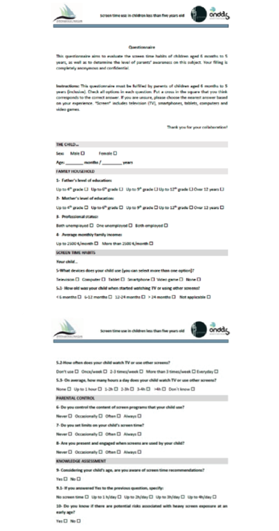 In this study the authors acknowledge the existence of some biases and limitations, namely the use of an not validated questionnaire, the fact that it was filled by parents, so some data may have been underestimated, particularly regarding screen exposure (for example, parents may have considered only a continuous period of time and may not have included every minute during the 24 hours on a regular day in which children have access to screens), the fact that we have not separated screen time on weekdays and weekends and that the sample was obtained in only two FHU and, as such, should not be seen as representative of the Portuguese population. Despite that, we want to reinforce the importance of these data in the characterization of the screen time habits profile in very young children. Further research is needed to better understand the impact of screen use on children and to develop effective strategies to reduce long-term media use by this young population.