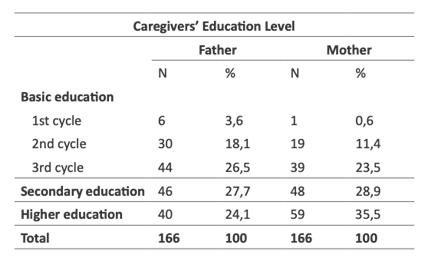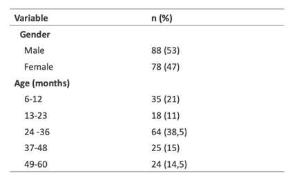 A total of 166 children were included in the study. Of these, 53% (n=88) were males. The mean age was 30 months (median 24 months) - Table I. About 25% (n=40) of fathers and 35% (n=59) of mothers had higher education (Figure II). Both parents were employed in 78% (n=129) of the cases, and in 86% (n=143) the average monthly family income was up to four times the minimum wage.
