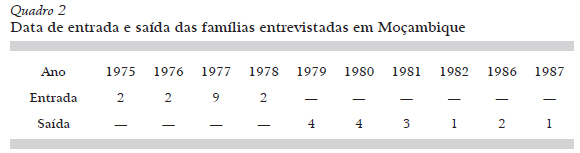 Podemos observar que a categoria cooperante chega a ser negada em uma postura mais radical, ou relativizada mediante sua adjetivação e especificação. Porém, as duas posturas procuram diferenciações frente à comunidade geral dos cooperantes, no primeiro testemunho, mas também do conjunto do grupo dos brasileiros, como parece apontar o segundo. Conforme mencionei anteriormente, a migração iniciada em 1975 com os exilados levou à construção de redes sociais que continuariam sendo mobilizadas para acessar o país até o final da década de 1980, portanto, após a Anistia, quando elas passariam a mover não mais exilados, mas brasileiros interessados em trabalhar no país. Apesar da mudança, muitas vezes eram as mesmas redes que serviam ao novo deslocamento desses brasileiros, fossem estes considerados militantes ou não. Entre as redes que passam a proporcionar a ida dos novos cooperantes não exilados brasileiros, eu destacaria aquelas conformadas pelo PCB, pelos organismos internacionais e pelas conexões estabelecidas entre os exilados que começam a voltar ao Brasil em 1979 e os que permaneceram em Moçambique, sobretudo através da Abrasso.[18] O quadro 2 auxiliará o entendimento do processo migratório. Ele ilustra os anos de entrada e saída dos entrevistados em Moçambique.