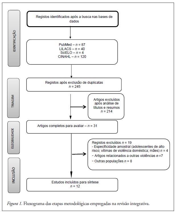 Etapa 2 - A pesquisa foi operacionalizada entre o dia 20 de abril de 2016 e 22 de abril de 2016, mediante pesquisas nas bases de dados PubMed, CINAHL (Cumulative Index to Nursing and Allied Health Literature), LILACS (Literatura Latino-Americana e do Caribe em Ciências da Saúde) e na biblioteca virtual SciELO (Scientific Electronic Library Online), no período compreendido entre 01/01/2011 e 31/12/2015. Este período de tempo foi definido pela intenção de integrar a literatura mais atual, dos últimos 5 anos. A seleção das fontes justificou-se pela abrangência de estudos multidisciplinares, com contemplação de produções nacionais e internacionais. Os descritores selecionados na PubMed foram os MeSH terms (Medical Subject Heading) e Subheadings: adolescent AND intimate partner violence OR dating abuse OR dating violence OR sexual harassment AND primary prevention OR health promotion OR school based services OR prevention and control. Na base de dados CINAHL, foram considerados os Headings: adolescence OR adolescent health AND intimate partner violence OR dating violence OR sexual harassment AND health promotion. Na LILACS e SciELO, foram usados os Descritores em Ciências da Saúde: adolescente AND violência por parceiro íntimo AND prevenção primária OR promoção da saúde OR saúde escolar. As estratégias utilizadas para selecionar os artigos identificados na pesquisa consideraram a proposta do estudo e os seguintes critérios de inclusão: um recorte temporal de 5 anos (2011-2015); idiomas contemplados (inglês, português e espanhol); modalidade da produção científica (apenas artigos científicos primários); produções exclusivas sobre intervenções de prevenção primária da VRI com adolescentes em contexto escolar. Foram excluídas as demais produções académicas, como teses, dissertações, monografias, e artigos de revisão de literatura.