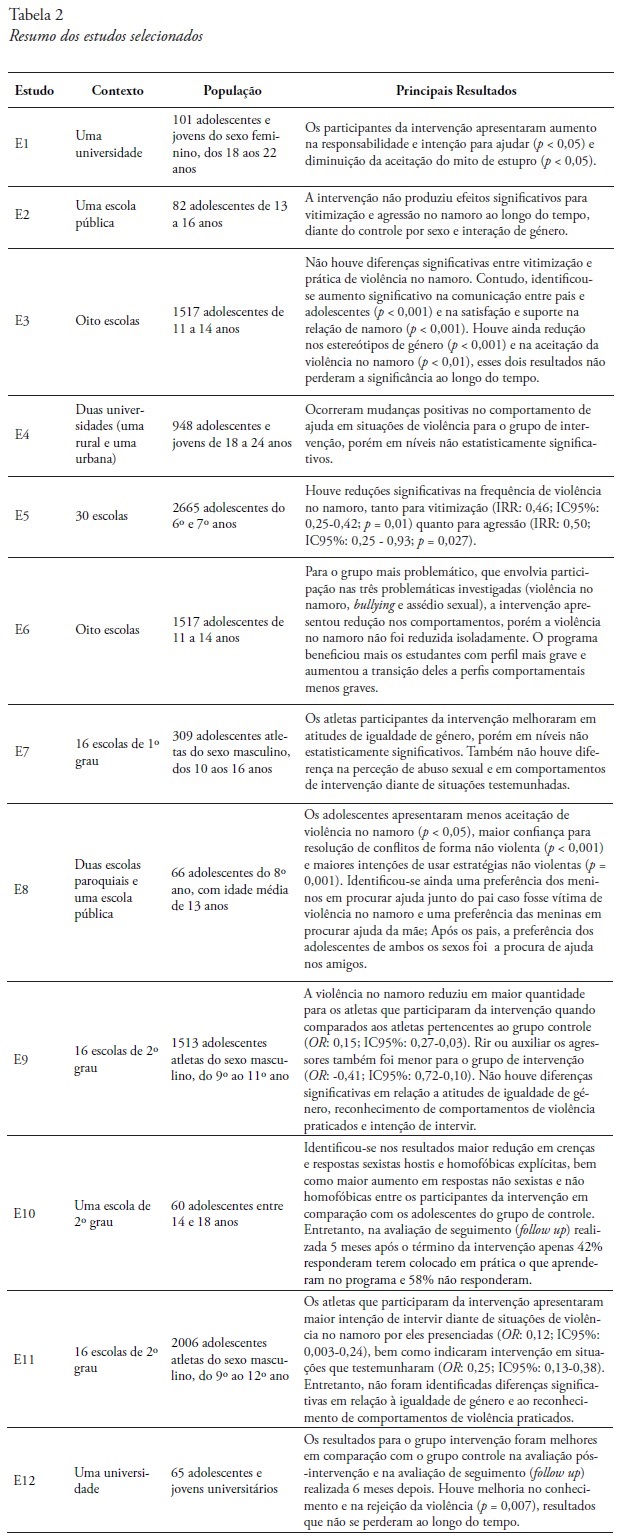 Para sintetizar a informação e facilitar a consulta, foi delineada a Tabela 2, com o contexto, população e principais resultados.