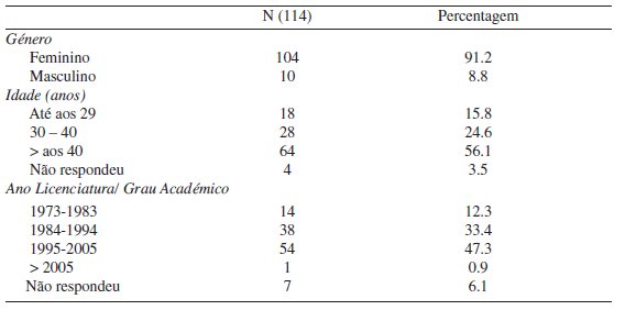 Relativamente à idade dos participantes, a maioria (56.1%) tem mais de 40 anos, sendo a idade cronológica média de 41 (DP = 8.42) e as mais baixa e elevada, respectivamente, 24 e 59 anos. Quanto ao ano de Licenciatura ou do Grau Académico, a maioria (80.7%) obteve-a/o entre os anos de 1984 e 2005.