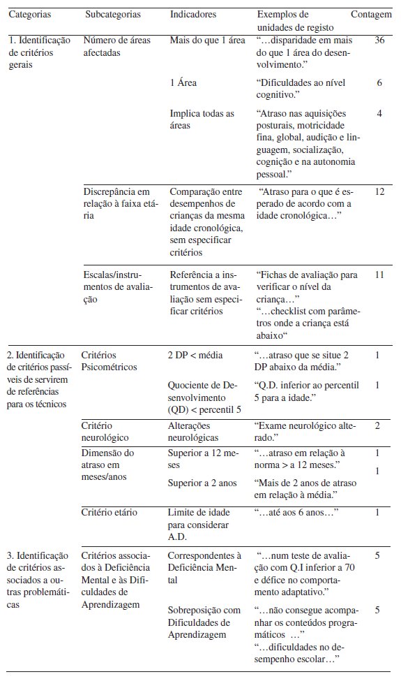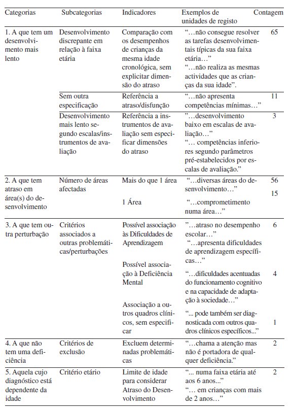 A primeira categoria, identificação de critérios gerais, é aquela que se apresenta com maior representatividade, salientando-se no seu interior, com maior número de unidades registo, a subcategoria relativa ao número de áreas afectadas que deve estar presente num quadro de atraso do desenvolvimento. Dado o carácter impreciso das unidades de registo respeitantes a esta subcategoria, pode-se apenas constatar que os inquiridos consideram que o atraso deve ocorrer, predominantemente, em mais do que uma área do desenvolvimento. Posteriormente, com alguma representatividade, surgem os critérios associados à presença de uma discrepância relativamente à faixa etária. Neste campo, salienta-se a comparação dos desempenhos de crianças da mesma idade cronológica, sem, contudo, se identificar o grau/dimensão da diferença ou discrepância que deve estar presente para se considerar atraso do desenvolvimento, bem como quais a(s) área(s) em que tal discrepância pode ocorrer. Ainda no âmbito de um registo vago, surgem os critérios referentes ao uso de escalas/instrumentos de avaliação infantil, sem qualquer discriminação/especificação complementar.