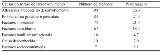A presença de uma visão multifactorial relativamente à etiologia do atraso do desenvolvimento por parte dos profissionais, bem como a concordância expressa em relação à importância de criar subcategorias do atraso do desenvolvimento, tendo em conta o respectivo grau de gravidade, também se nos apresentam como algo positivo. E isto, porque neste último caso, admitimos a possibilidade de tal se ficar a dever ao facto dos próprios profissionais estarem cientes da amplitude inerente ao termo. Além disso, e em relação a qualquer um dos casos, a perspectiva dos inquiridos vai de encontro ao apontado nalgumas pesquisas. Por exemplo, quando é possível identificar factores etiológicos no atraso do desenvolvimento, eles são, com frequência, diversificados (Shevell, Majnemer, Rosenbaum, & Abrahamowicz, 2000; Srour, Mazer, & Shevell, 2006). Por outro lado, tem-se observado que a coexistência de atrasos em mais do que uma área do desenvolvimento corresponde a uma maior gravidade ( Valtonen, Ahonen, Lyytinen, & Lyytinen, 2004) ou a um prognóstico mais desfavorável ( Shevell, Majnemer, Platt, Webster, & Birnbaum, 2005).