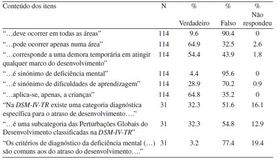 As questões, dirigidas apenas aos Psicólogos e aos Pediatras, que se propõem determinar se os mesmos consideram o atraso do desenvolvimento como uma perturbação que consta na DSM-IV-TR, revelaram, de um modo geral, tendências heterogéneas, para além do número de respostas omissas ter sido apreciável. Ligeiramente mais de metade dos profissionais inquiridos parece saber que o atraso do desenvolvimento não existe como categoria na DSM-IV-TR, nem faz parte das Perturbações Globais do Desenvolvimento, classificadas pela mesma. Contudo, cerca de um terço mostra uma posição divergente, isto é, considera que o atraso do desenvolvimento integra a DSM-IV-TR e as Perturbações Globais do Desenvolvimento. Quanto à afirmação relativa ao facto dos critérios de diagnóstico da deficiência mental e do atraso do desenvolvimento serem comuns, a maioria (77.4%) revela saber que tal afirmação é falsa.