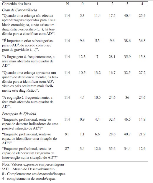 Em segundo lugar, colocam-se algumas questões mais específicas, referentes a parâmetros conceptuais particulares (por ex., número de áreas afectadas) e ao uso do termo em estudo (por ex., sobreposição com outras problemáticas, tais como a Deficiência Mental/Dificuldade Intelectual e as Dificuldades de Aprendizagem). Em último lugar, procurou-se avaliar as percepções de eficácia dos profissionais perante uma situação de possível atraso do desenvolvimento, ou seja, até que ponto se sentiam capazes de a detectar e identificar, bem como de nela intervir.