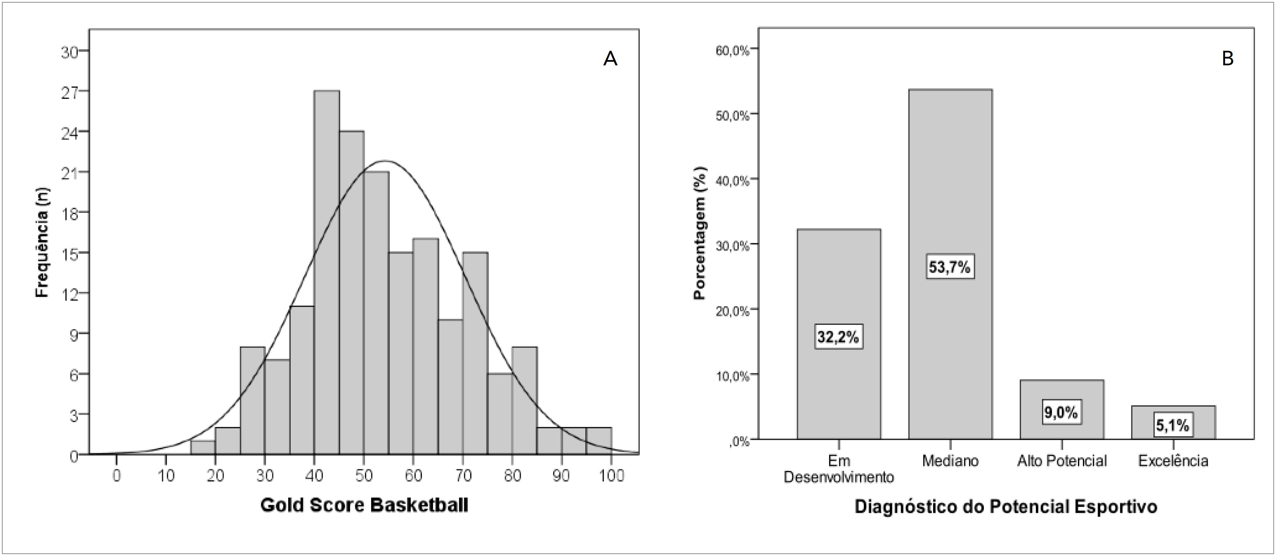Figura 1 (A) Histograma do Gold Score Basketball e (B) classificação do potencial esportivo de jovens basquetebolistas do sexo masculino (n= 178).