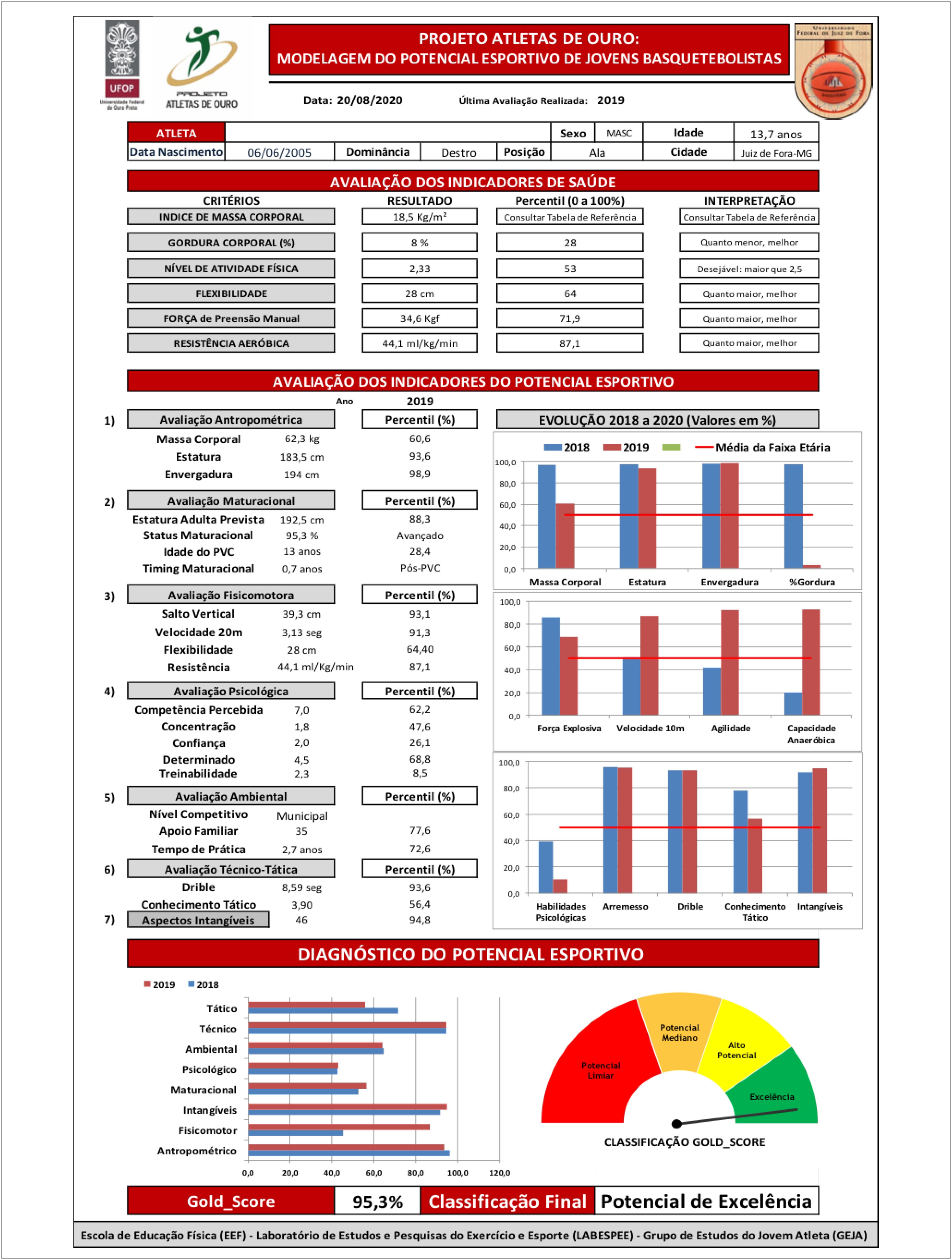 Após a realização dos testes, o avaliado recebe um laudo individualizado contendo todos os seus resultados. Na Figura 2 consta um exemplo do Gold Score Basketball.