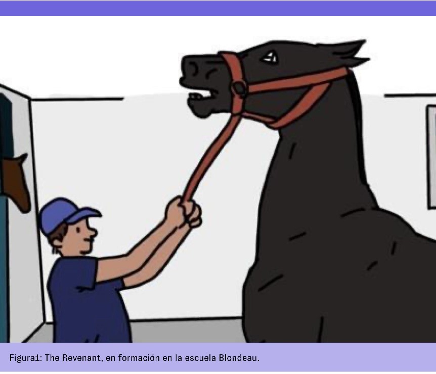 Para Nicolas Blondeau, la formación apunta a ayudar al caballo a vencer sus miedos, y fue precisamente ese trabajo lo que realizó con The Revenant, consiguiendo que el animal comprendiera que el contacto táctil con el humano podría no encerrar peligro alguno y hasta ser algo bueno para él. En cuanto al primer aprendizaje, la colocación del bocado, comprobamos en el video que el caballo alza la cabeza con fuerza. Nicolas Blondeau le murmura una cantinela “muy bien, ahí va, eres un sol…” que envuelve al equino. Al mismo tiempo, deja sus manos sobre la nuca del caballo hasta que este transforme su representación del contacto y lo encuentre soportable, luego agradable. Cuando Nicolas Blondeau se aleja, el propio animal es el que lo sigue. Algo ha cambiado en su relación con el humano. Lo que era vivido como un sufrimiento se torna en una vivencia positiva.