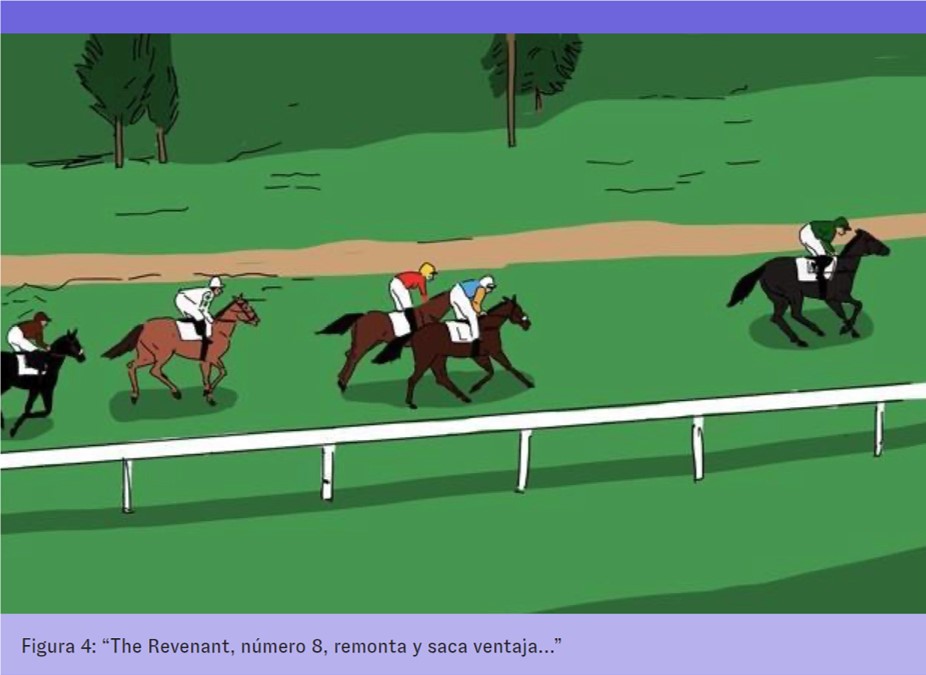 Notamos que hay un compromiso por parte del caballo en el trabajo y, como describe Dejours (2012, p. 20), se trata de “un compromiso de la personalidad para hacer frente a una tarea enmarcada por distintas limitaciones (materiales y sociales)”. En efecto, quien corre la carrera es el caballo. El entrenador decide la estrategia y el jockey la sostiene en la relación con el animal y durante la carrera. La estrategia de los humanos es que The Revenant permanezca durante la mayor parte de la carrera al final del pelotón y remonte después de la última valla, pero el que corre es él, él es el que salta, el que gana.