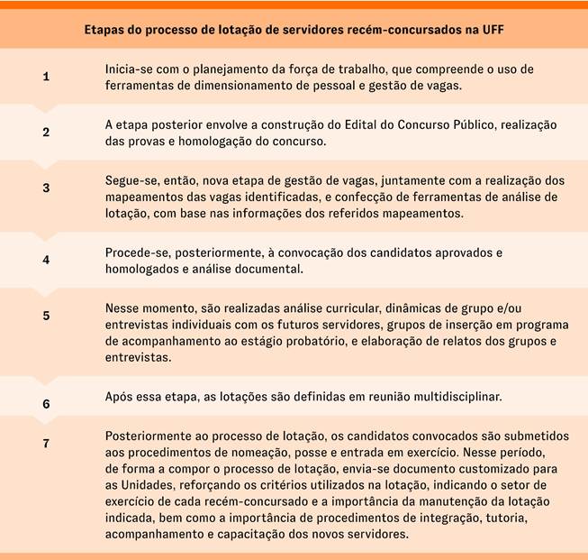 Cabe destacar, entretanto, que as etapas da análise de lotação e a forma de concretizá-la não estão expressamente previstas em lei, ou seja, legalmente, a convocação de servidores recém-concursados pode acontecer independente dessas etapas, que não são obrigatórias. Apesar disso, considerando que o concurso público - que possui peculiaridades e limitações próprias, inerentes a qualquer processo de recrutamento e seleção - é o meio disponível mais democrático e isonômico para a seleção de servidores públicos no combate ao patrimonialismo, ao clientelismo e à corrupção no acesso da população aos cargos e aos empregos públicos (Azevedo & Loureiro, 2014) a equipe de trabalhadores responsável pelo processo de análise de lotação de servidores recém-concursados tem buscado estratégias que qualifiquem também essa etapa posterior ao concurso.