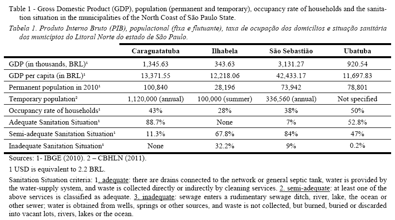 The permanent population of all municipalities of the North Coast is 290,429 inhabitants, but this number increases significantly during the summer high season (Table 1). As an indicator of this process, all the municipalities have a high proportion of non-occupied households (seasonal residences), especially Ubatuba, where 50% of the households fall in this category.