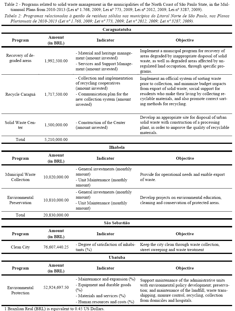 The administration of Caraguatatuba presented three programs focused on solid waste management. These dealt with the recovery of degraded areas (former landfill areas), implementation of municipal recycling, and appropriate disposal of solid waste. The indicators adopted in the MAP were based on the amount of funds invested in the program (Table 2). The amount reserved for these activities corresponded to 0.40% of the expected budget for the period (2010-2013), according to the municipal MAP.