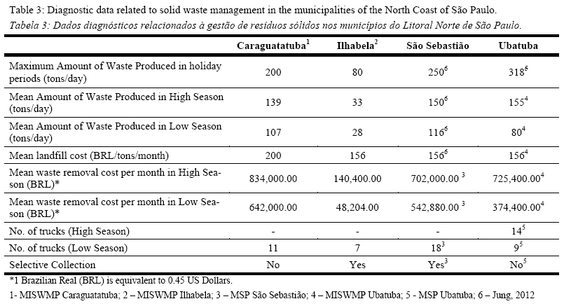 The daily mean amount of waste produced during the low seasons increases by around 30% during the high seasons in Caraguatatuba and São Sebastião, around 20% in Ilhabela, and around 90% in Ubatuba (Table 3). During holidays this increase can be even greater; the maximum values recorded in these municipalities were 86% in Caraguatatuba, 185% in Ilhabela, 115% in São Sebastião and around 300% in Ubatuba (Table 3). As a result of the increase in waste production during high season, the costs of disposal increase in the same proportion, as well as the effort required in collection and street sweeping.