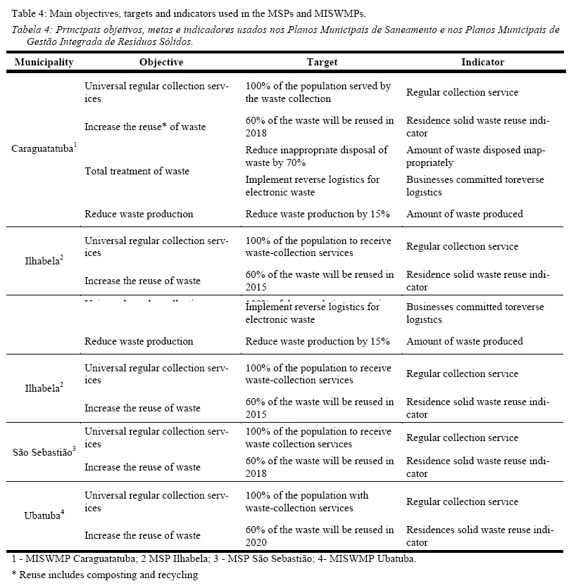 The Municipal Sanitation Plans (MSPs) and Municipal Integrated Solid Waste Management Plans (MISWMPs) analyzed were published after 2012, and the MISWMPs from Ubatuba and Caraguatatuba were published in 2014. The aspects considered in the analysis were (1) if the diagnosis in the plan considered the population growth during high season and the kind of solid waste collected and disposed of; (2) if the municipality had a well-established recycling program; (3) if the municipality established a target for the plan; (4) if the municipality had adequate performance indicators.