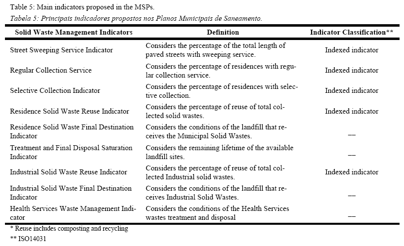 The analyses were based on qualitative parameters, and a general profile was drawn for each municipality based on the public policies, MAPs, MSPs, and MISWMPs (when available). The indicators were classified and analyzed according to Mosse & Sontheimer (1996) and Greene & Tonjes (2014), evaluating if they were inputs or process indicators, and discussing their weaknesses and strengths.